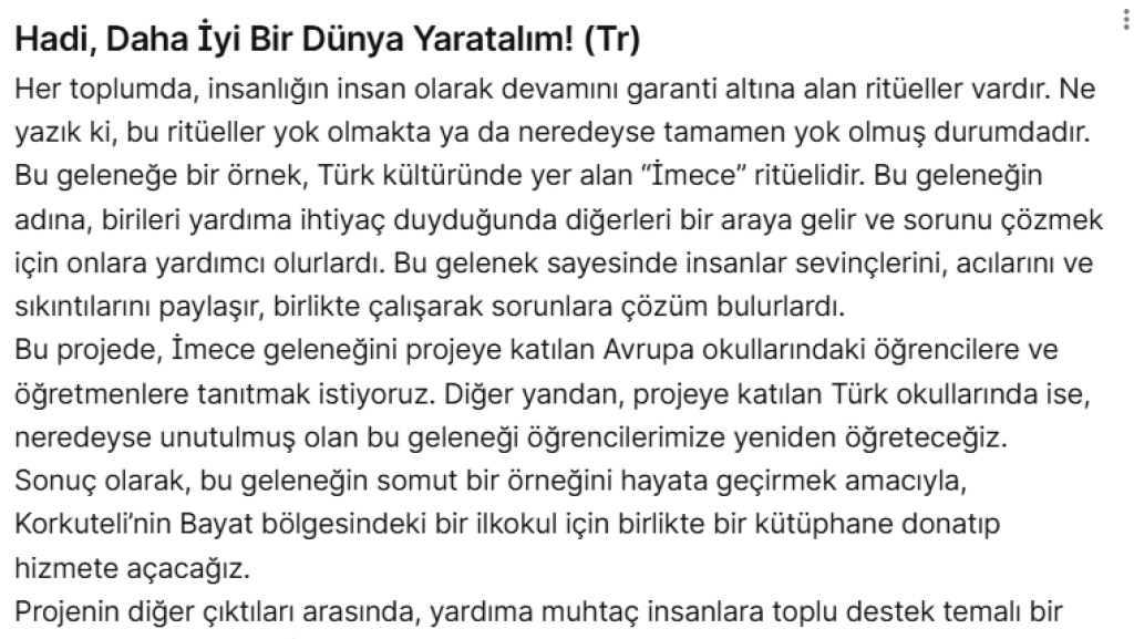 Okulumuzda 2024-2025 eğitim öğretim yılında LETS MAKE A BETTER WORLD (DAHA İYİ BİR DÜNYA YARATALIM) e-twinning projesi yapılmaktadır.Okulumuzdan Müdür yardımcısı Musa GÜNDOĞDU,Sınıf öğretmeni Figen İNCİ ve okul öncesi öğretmeni Melike ÇOBAN ile birlikte Türkiye'den 7,Bosna Hersek'ten 2 ,Litvanya'dan 1 ve Bulgaristan'dan 1 ortağımız vardır.Projemizdeki amaç ve görseli aşağıda belirtilmiştir.